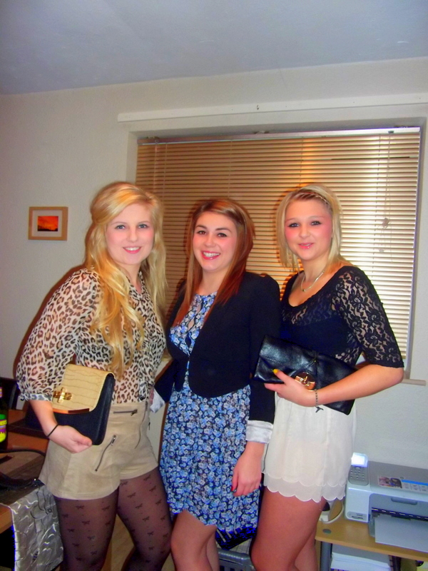 My friend zoe in the middle is wearing a cute little flowery hight neck dress from topshop and her fitted cropped blazer also topshop. My friend jade needed an outfit and ended up raiding my wadrobe, ending up in my cute little nighty shorts (well thats what i call them because there all silky and comfty!) from h and m, and my lacey leotard from select which i bought in the sale about a million years ago!